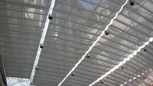 開合模式:單開、雙開 效果:天棚簾完全展開后,面料呈現均勻的波浪效果 應用場所:大中型的遮陽場所,廣泛應用于賓館、寫字樓等大型采光屋頂,用于調光節能、保持室內溫度,避免強光輻射,改善采光效應等。